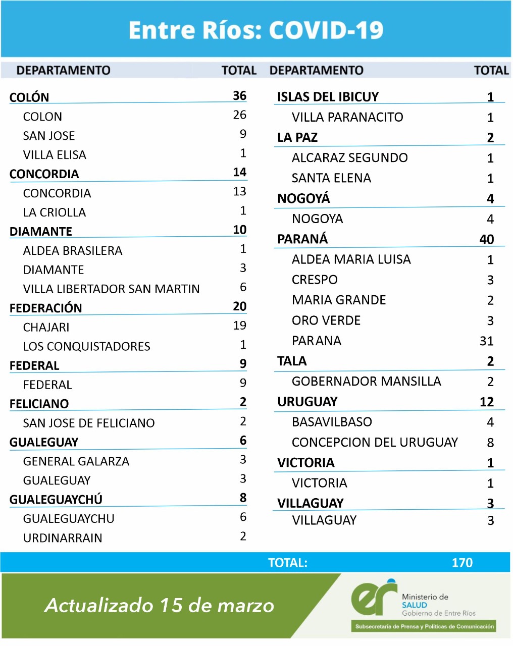 El área de Vigilancia Epidemiológica del Ministerio de Salud, confirmó que en Entre Ríos este lunes se registraron 170 nuevos casos de coronavirus.