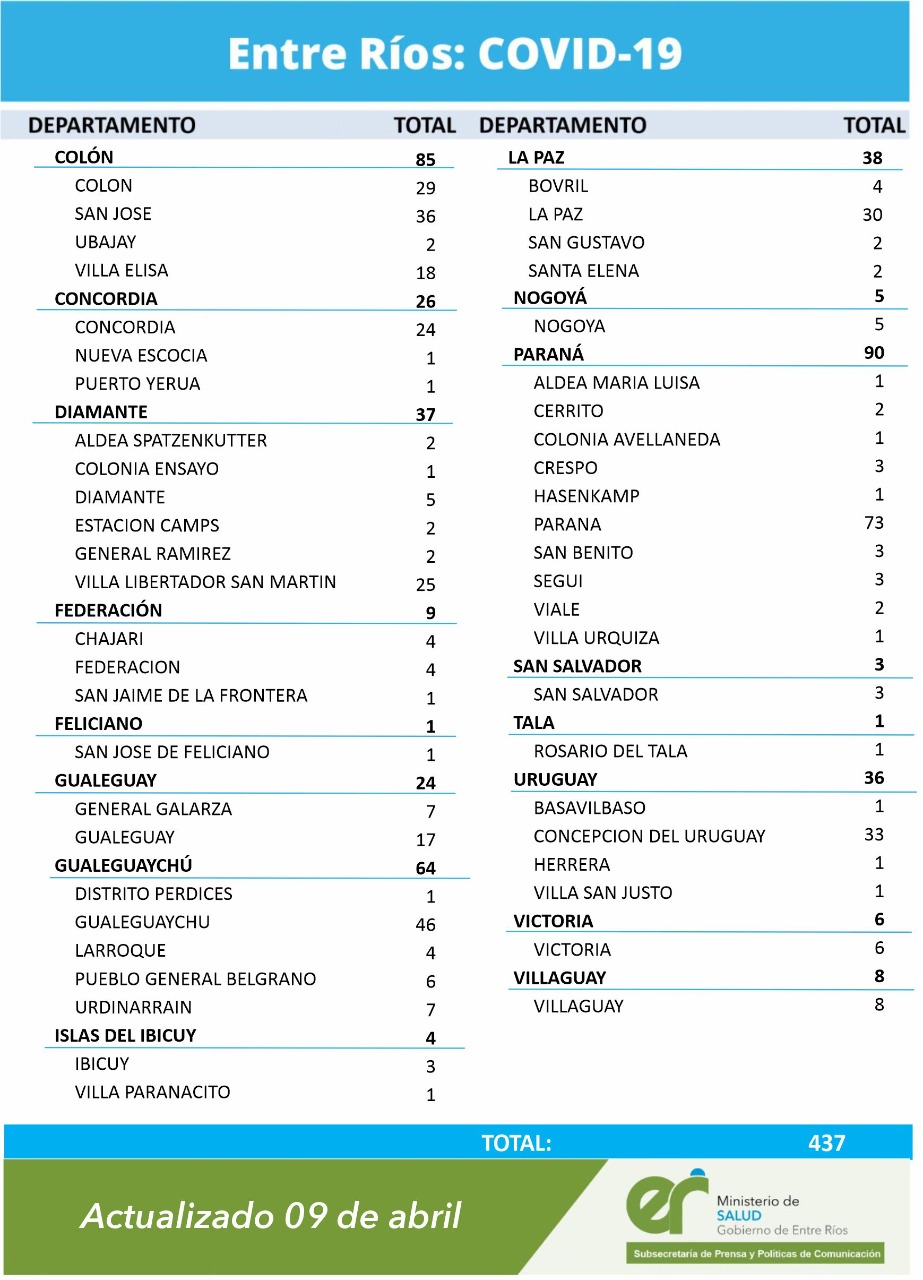 En virtud de los datos reportados este viernes por el área de Vigilancia Epidemiológica del Ministerio de Salud, en Entre Ríos se han sumado 437 casos de coronavirus.