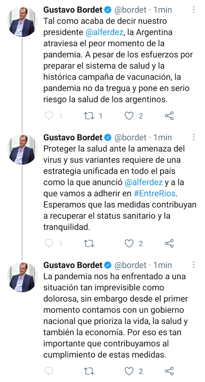 Tal como acaba de decir nuestro presidente @alferdez, la Argentina atraviesa el peor momento de la pandemia. A pesar de los esfuerzos por preparar el sistema de salud y la histórica campaña de vacunación, la pandemia no da tregua y pone en serio riesgo la salud de los argentinos.”, publicó el mandatario en las redes sociales.