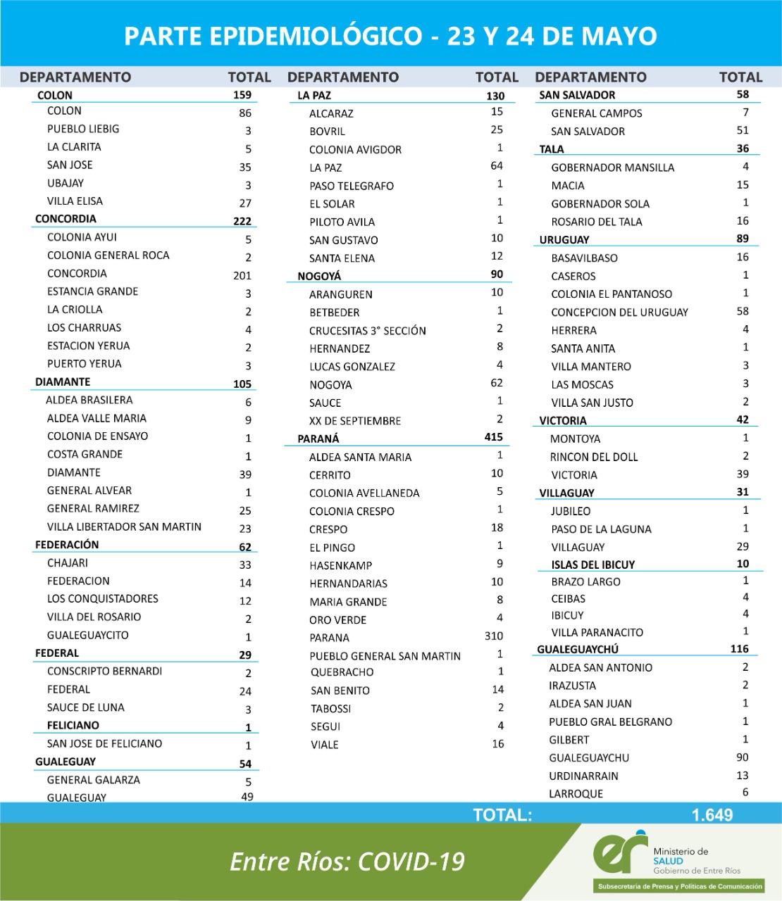 El área de Vigilancia Epidemiológica del Ministerio de Salud, confirmó que en Entre Ríos entre este domingo y lunes se registraron 1649 nuevos casos de coronavirus, distribuidos en 873 el domingo y 776 el lunes.