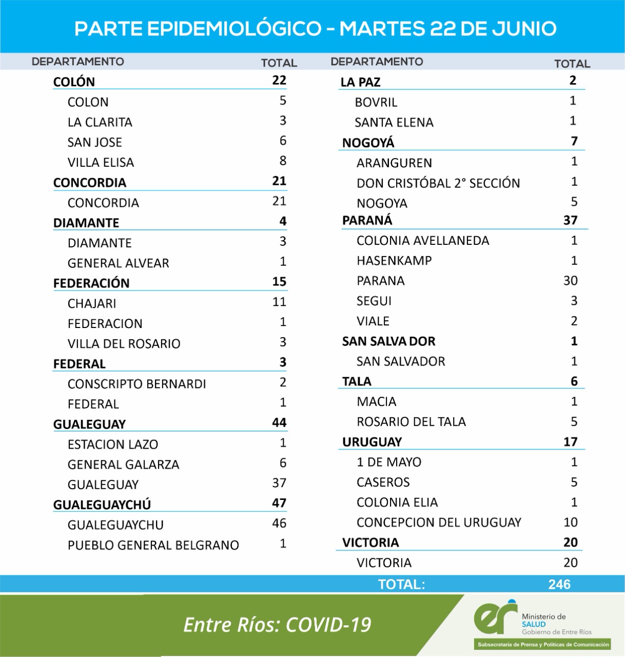 El área de Vigilancias Epidemiológica del Ministerio de Salud, confirmó que en Entre Ríos este martes se registraron 246 nuevos casos de coronavirus.