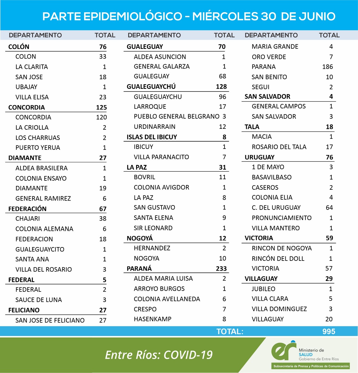 El área de Vigilancias Epidemiológica del Ministerio de Salud, confirmó que en Entre Ríos este miércoles se registraron 995 nuevos casos de coronavirus.