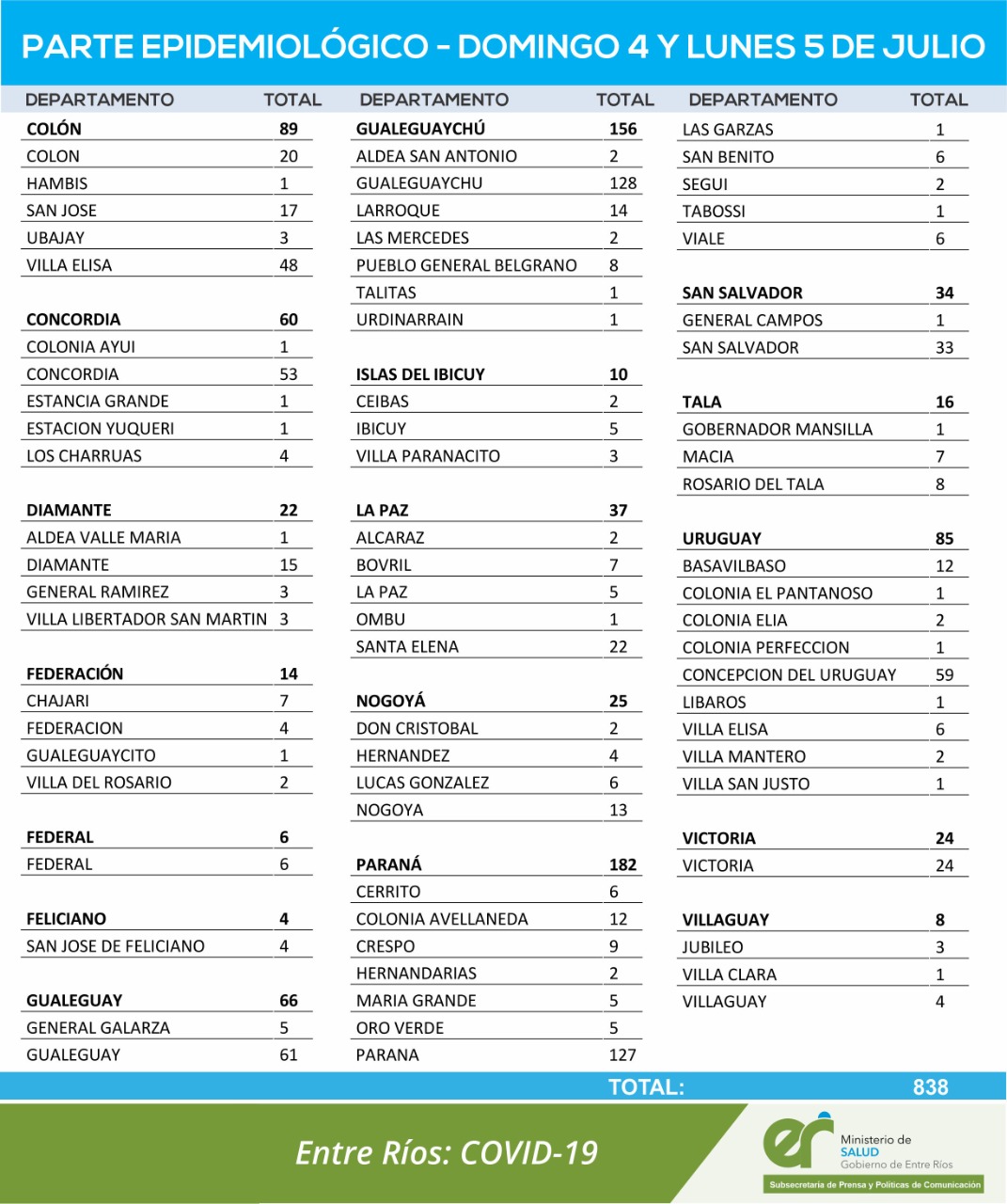 El área de Vigilancias Epidemiológica del Ministerio de Salud, confirmó que en Entre Ríos se registraron 838 nuevos casos de coronavirus, los que corresponden a la suma de dos días: 502 del domingo y 336 del lunes 5 de julio.