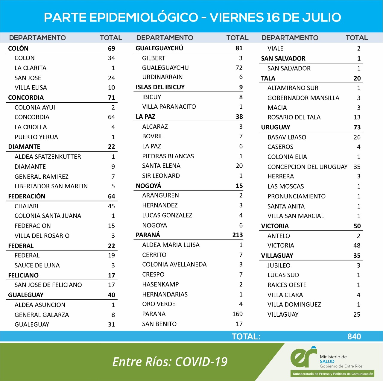 El área de Vigilancias Epidemiológica del Ministerio de Salud, confirmó que en Entre Ríos este viernes se registraron 840 nuevos casos de coronavirus.