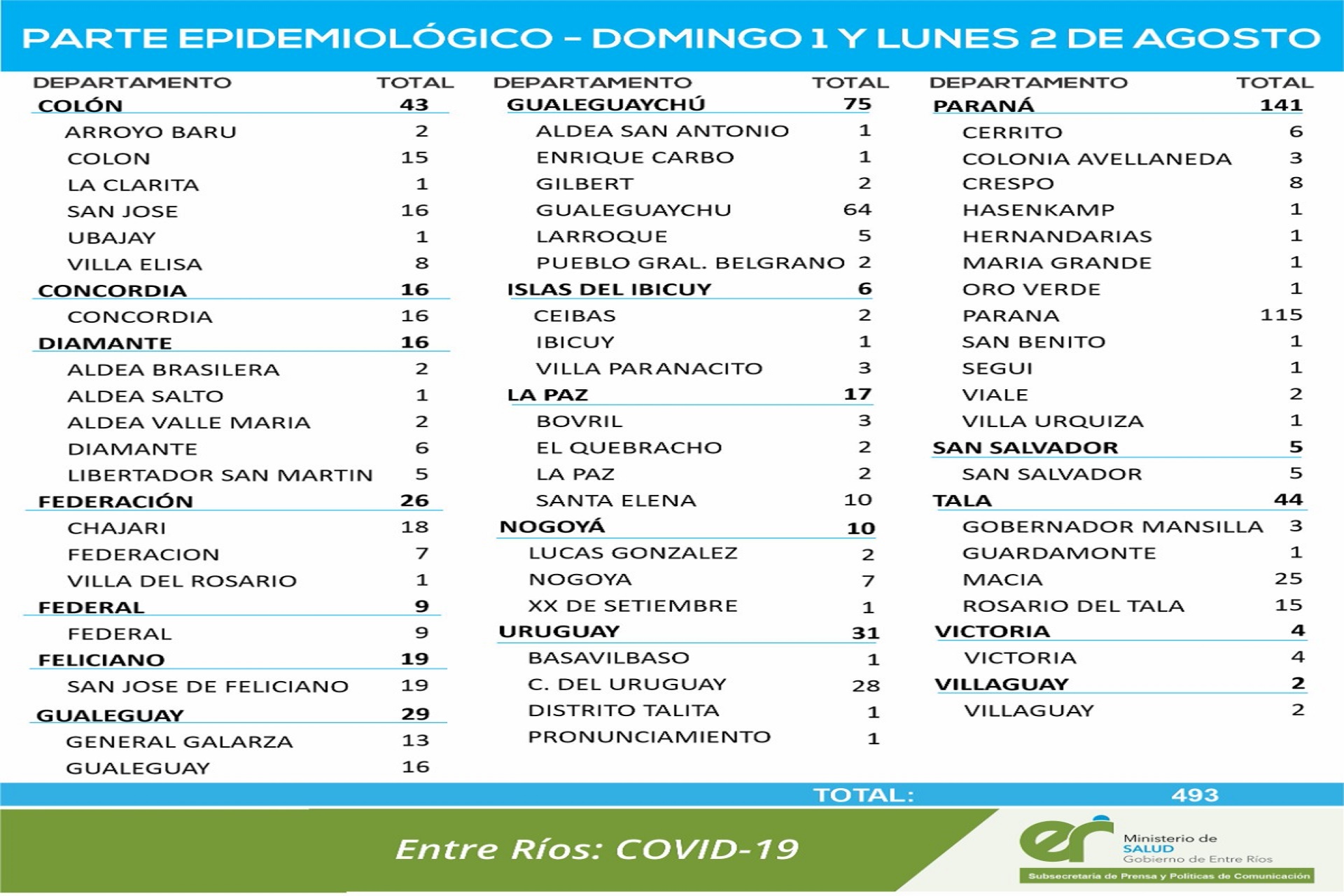 En virtud de los datos reportados por el área de Vigilancia Epidemiológica del Ministerio de Salud, en Entre Ríos se han sumado 493 casos de Coronavirus. Los mismos corresponden a la suma de dos días: 351 del domingo 1° y 142 del lunes 2 de agosto.