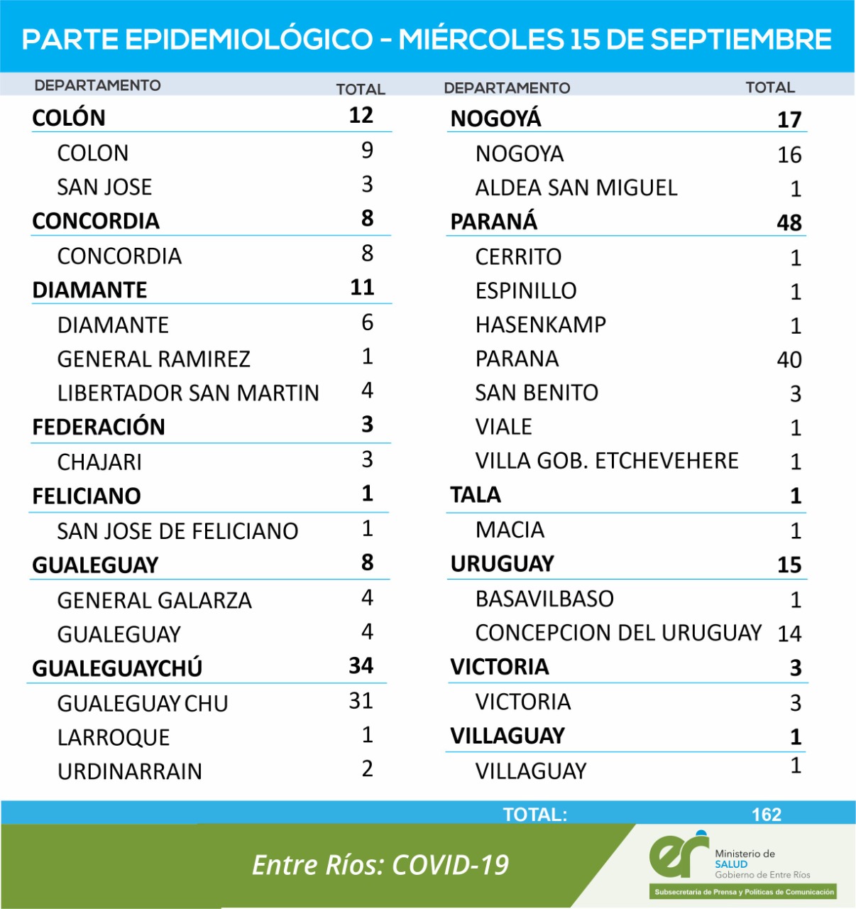 El área de Vigilancias Epidemiológica del Ministerio de Salud confirmó que en Entre Ríos este miércoles 15 de septiembre se registraron 162 nuevos casos de coronavirus.