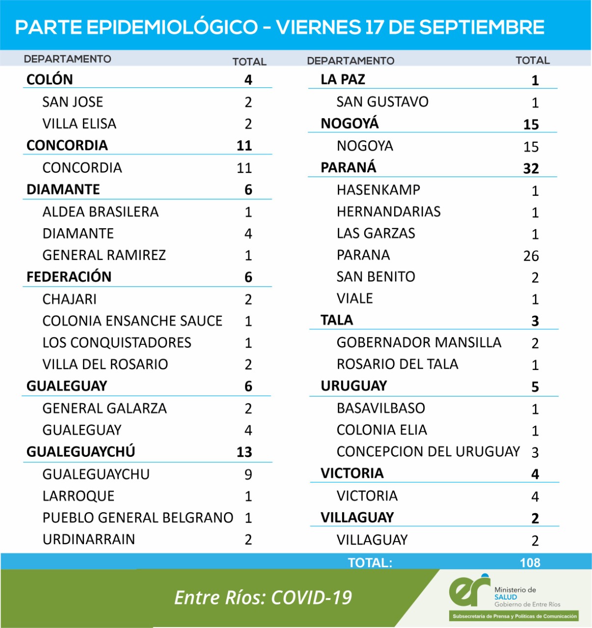 El área de Vigilancia Epidemiológica del Ministerio de Salud confirmó que en Entre Ríos este viernes 17 de septiembre se registraron 108 nuevos casos de coronavirus.