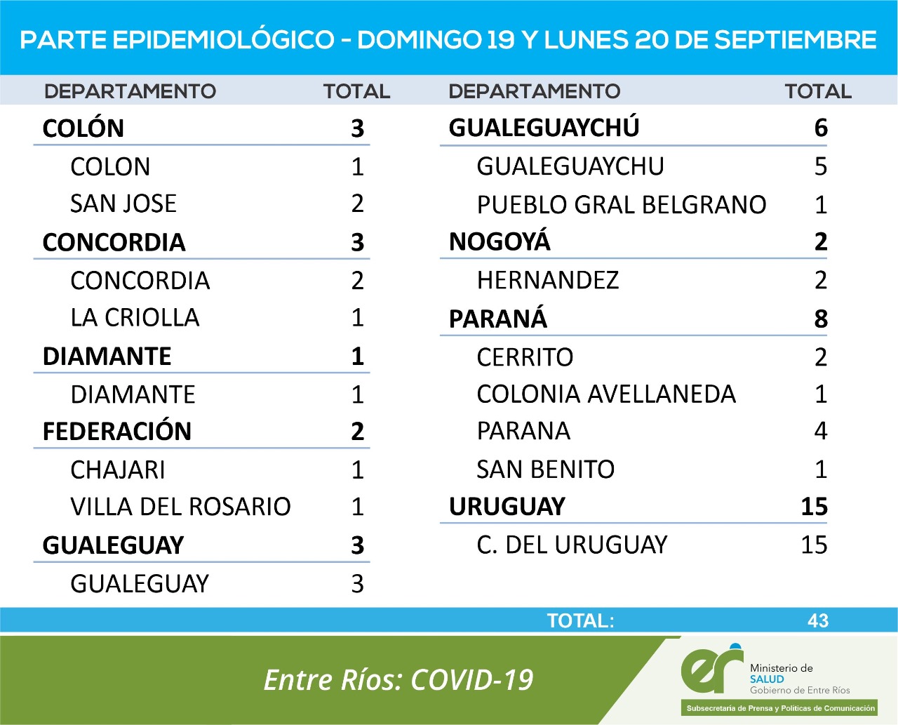El área de Vigilancia Epidemiológica del Ministerio de Salud confirmó que en Entre Ríos se han sumado 43 casos de Coronavirus. Los mismos corresponden a la suma de dos días: 40 del domingo 19 y 3 del lunes 20 de septiembre.
