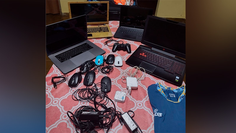 En la valija, que fue secuestrada, había una laptop APPLE Macbook Pro; una Notebook sin marca visible; una Notebook HP modelo 14-dk1003dx; una Notebook OMEN Bang & Olufsen, modelo 15-ce002la; ropa, entre las que se encuentra una remera Sonder de la Selección Argentina de Voley; varios mouse y cargadores. Todos estos elementos habían sido denunciados como robados.