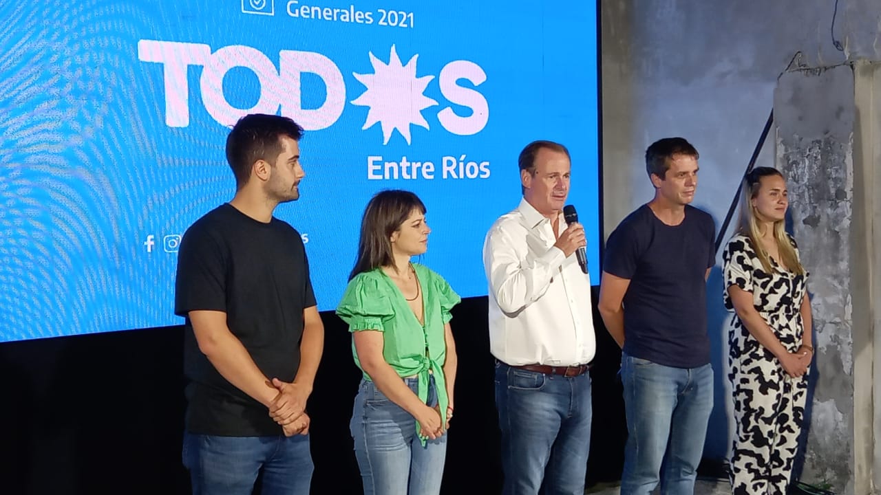 Gustavo Bordet, Enrique Cresto, Carolina Gaillard, Tomás Ledesma, Brenda Ullman estuvieron en la tarima en la sede del Partido Justicialista, en Paraná, para hablar con la prensa tras conocerse los resultados que fueron, básicamente, similares a los de las PASO.