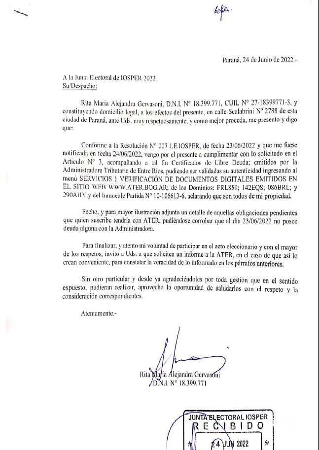 En la mañana de este viernes, los apoderados de la Federación de Jubilados y Pensionados Provinciales de Entre Ríos respondieron a la Resolución N°7 de la Junta Electoral de Iosper, presentando la documentación necesaria que certifica que la candidata a directora suplente por el agrupamiento Pasivos, María Alejandra Gervasoni, no tiene deuda de ningún tipo con la Administradora Tributaria de Entre Ríos (ATER).