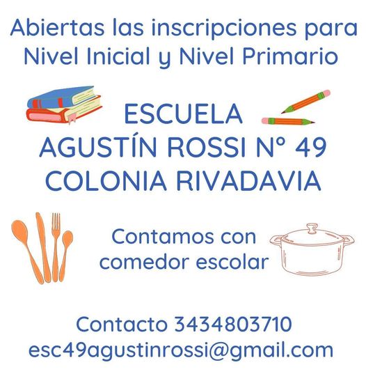 Se informó desde la Comunidad Educativa de la Escuela Nº 49 “Agustín Rossi” de Colonía Rivadavia, que se encuentran abiertas las inscripciones para Nivel Inicial y Primario para el ciclo lectivo 2023.