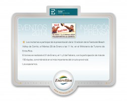 El próximo martes 28 de enero en la sala de conferencias del Ministerio de Turismo de la Provincia, se desarrollará la presentación formal de lo que será la 12º edición del torneo de Beach Voley en la Ciudad de Cerrito.