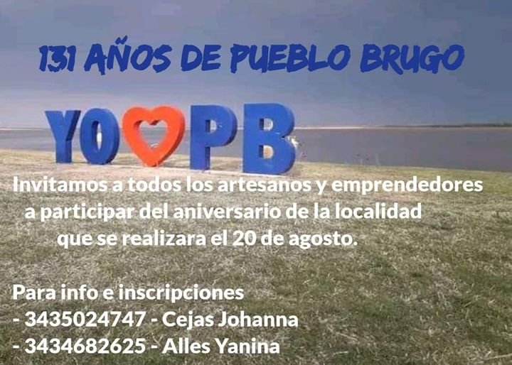 La Municipalidad de Pueblo Brugo convoca a artesanos, artesanas y emprendedores a participar de las actividades que se realizarán en el marco de las celebraciones por el aniversario de la ciudad. La actividad central será el domingo 20 de agosto.