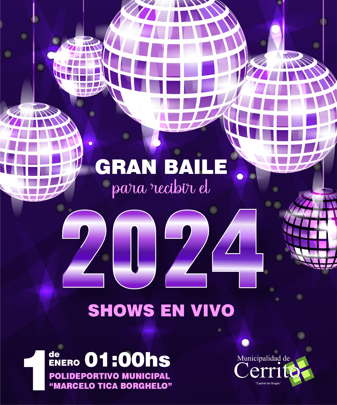 La Municipalidad de Cerrito te invita a recibir el nuevo año con la mejor música y el baile contagioso de Cuarteto Gigante, Súper Banda Estrella y el Clan Chamamecero en el Playón del Polideportivo Municipal a partir de la medianoche.