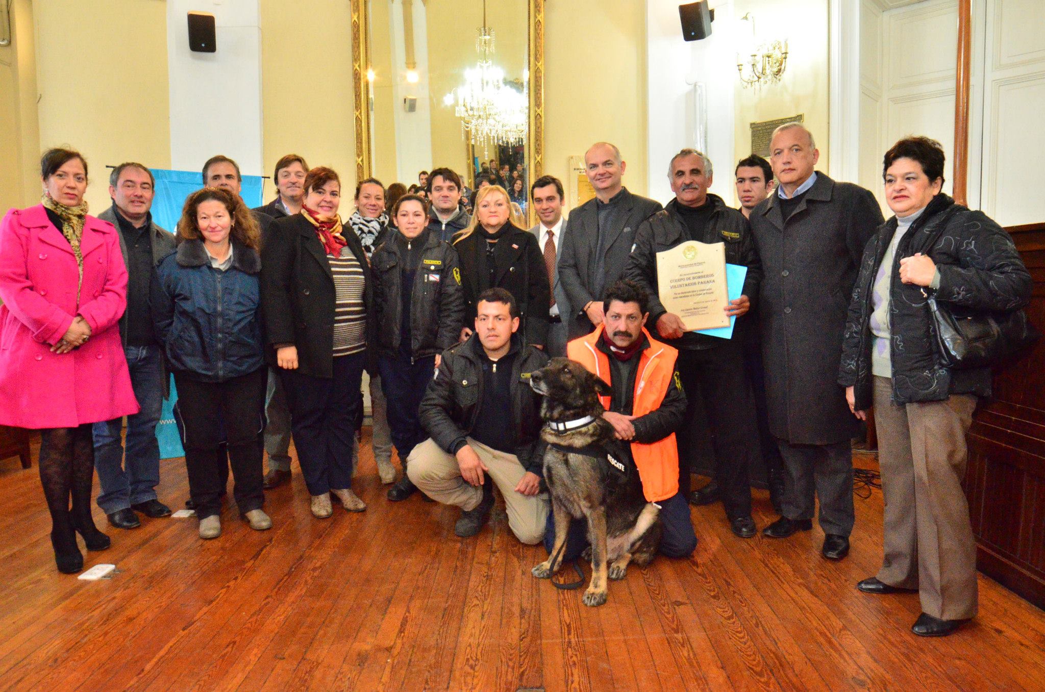 Durante el acto, se hizo entrega de una placa al Jefe de Bomberos Voluntarios de Paraná, que fue acompañado por una delegación, entre los que se contó “Luigi”, uno de los perros que integra la Brigada Canina que estuvo en la ciudad santafesina.