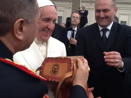 En nombre de los Bomberos Voluntarios, le obsequiaron al papa Francisco, un equipo de Mate forrado en Cuero, con la dedicatoria de los Bomberos Voluntarios Entrerrianos grabada en el mismo.