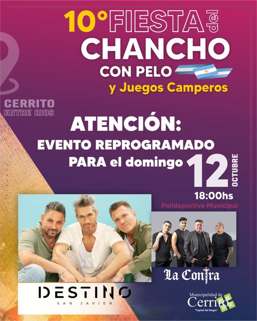Debido a la tormenta de este sábado, la organización se vio obligada a interrumpir la actividad de hoy. La misma se desarrollará este domingo desde las 18 horas en su segunda parte, con Destino San Javier y La Contra en el escenario.