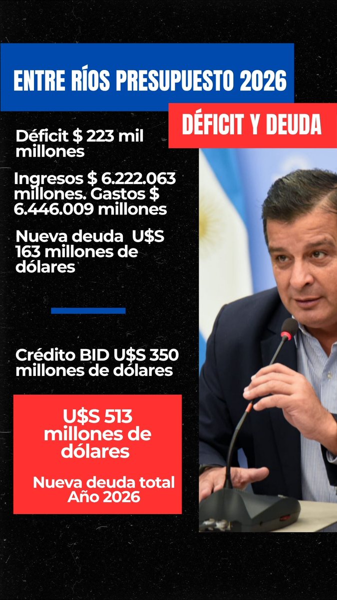 Luego enfatizó: “El Gobernador Frigerio anunció hace pocas semanas que tomaría una nueva deuda con el Banco Interamericano de Desarrollo (BID) por U$S 350 millones de dólares, con el aval de la Nación, supuestamente con destino a obras de rutas provinciales. Ese crédito del BID no está en el Presupuesto 2026. En caso de concretarse ese financiamiento adicional, la deuda aumentaría en USS 513 millones en un solo año, verdadero récord en la historia de la Provincia de Entre Ríos. Esta decisión representa una fuerte carga de servicios de capital y de intereses en dólares para todos los entrerrianos de la presente y de las futuras generaciones”, cerró.(Fuente: X Casaretto)