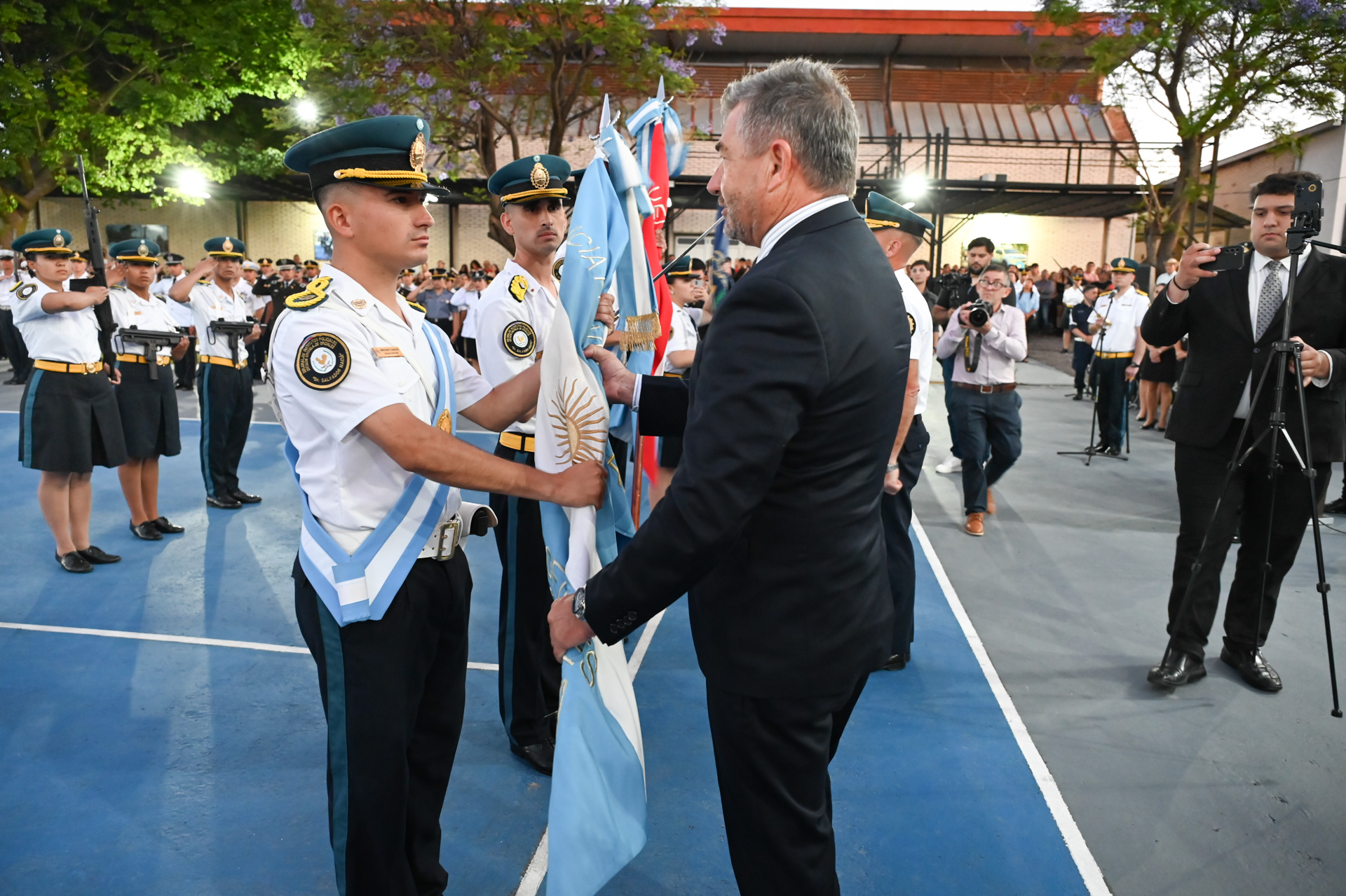 El ministro Roncaglia destacó la importancia de la finalización del ciclo lectivo: “Presenciar este momento, el traspaso de la Bandera y ver a nuestros cadetes me emociona mucho. Es importante acompañar este tipo de eventos porque quienes egresan cumplen una función muy importante en la seguridad pública. Ellos están cumpliendo un sueño de ser policías y nosotros estamos orgullosos de su formación”, sostuvo.