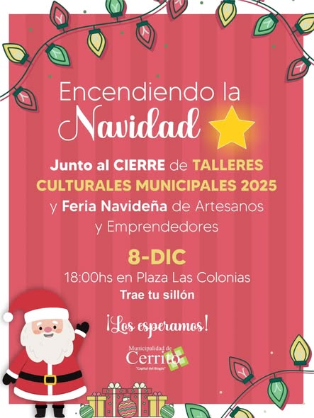 Este próximo lunes 8 de diciembre, a las 18:00 horas será una tarde especial en Plaza Las Colonias, donde se celebrará el tradicional Encendido de la Navidad, junto al cierre de los Talleres Culturales Municipales 2025 y una feria de artesanos y emprendedores.