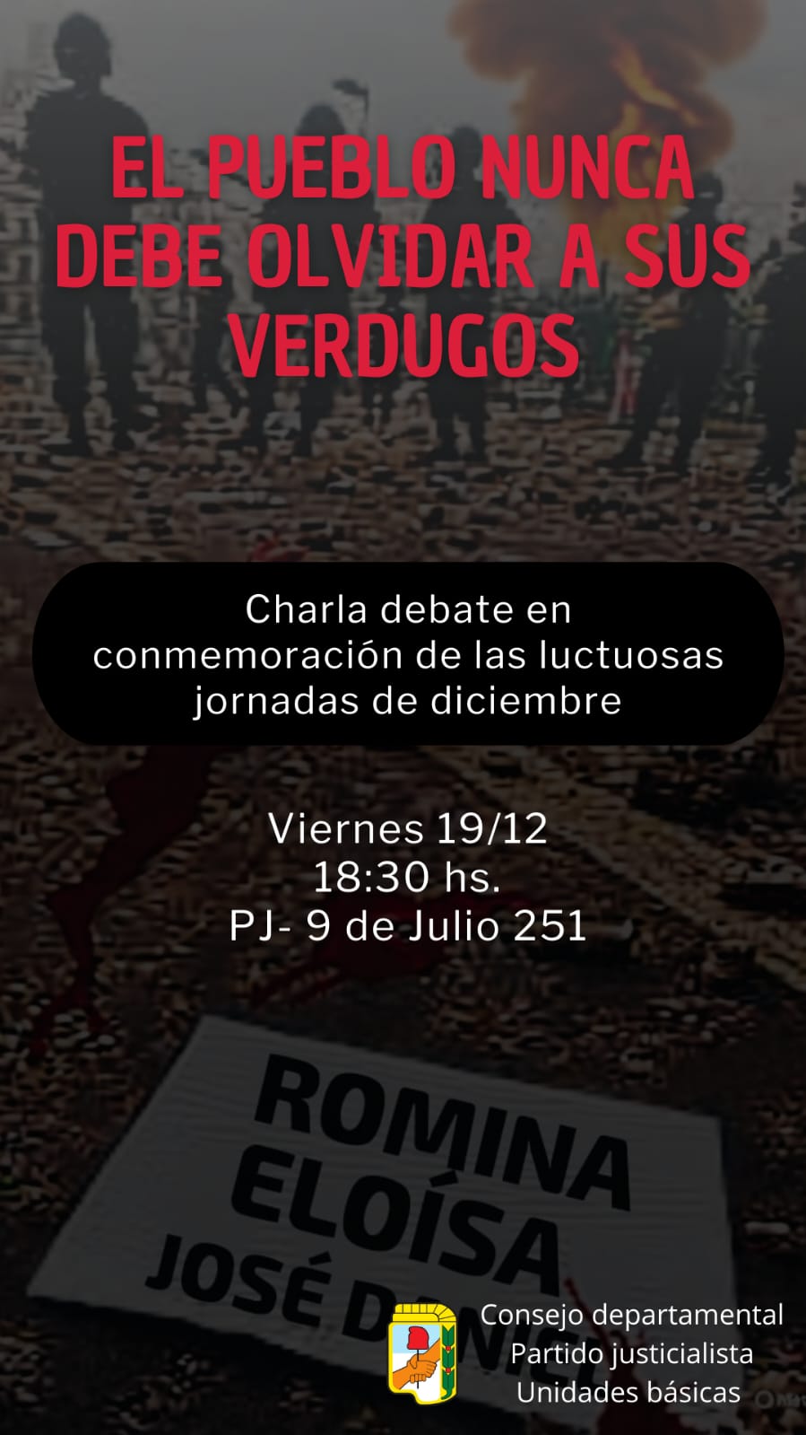 Este viernes 19 de diciembre a las 18:30 HORAS en la sede del PJ, se llevará a cabo una charla para reflexionar sobre la brutal represión de 2001 y lo que acontece en estos días en calles de la ciudad de Buenos Aires, principalmente con la manifestación de los jubilados.