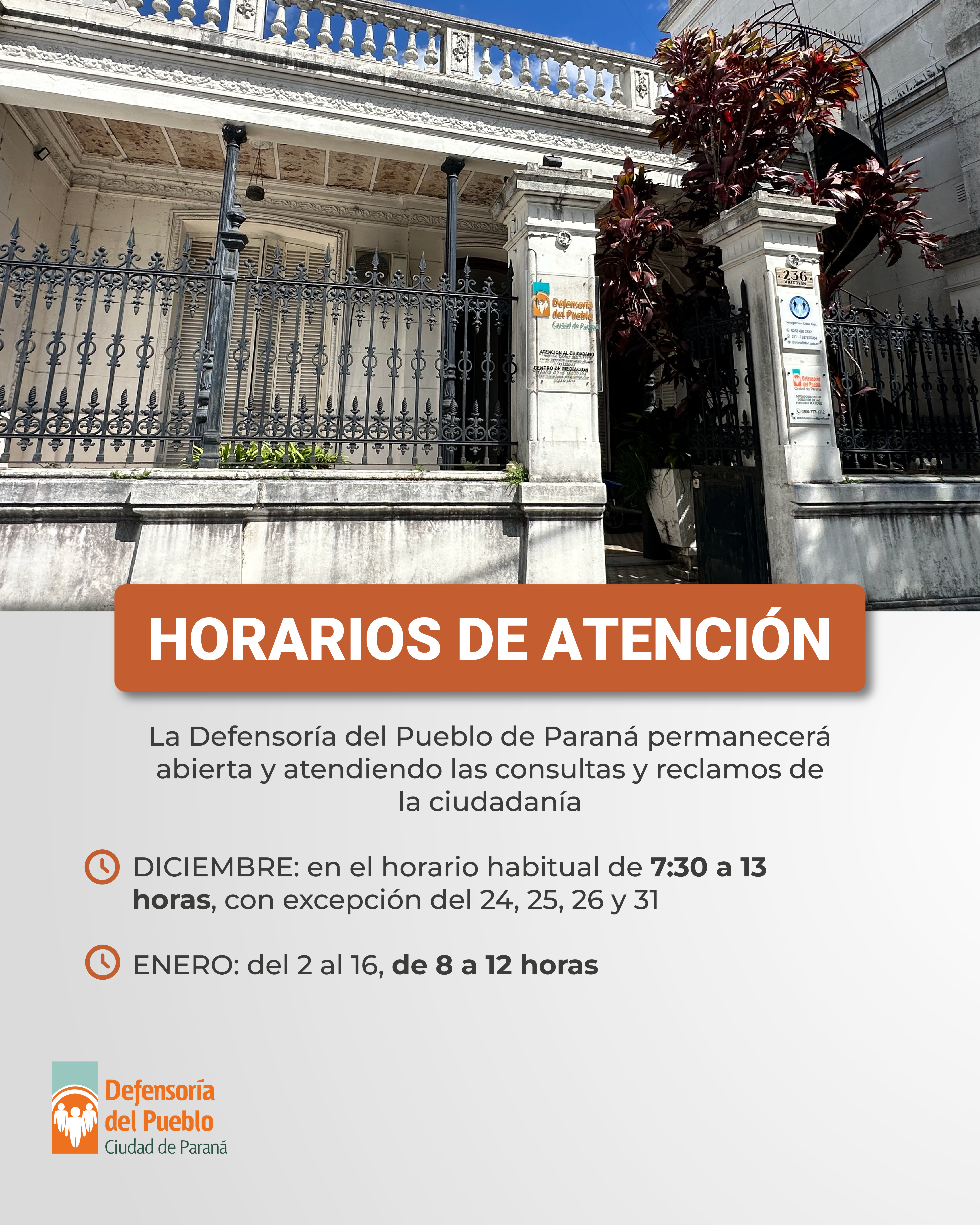 La Defensoría del Pueblo de Paraná permanecerá abierta y continuará atendiendo las consultas y reclamos de la ciudadanía, con excepción del 24, 25, 26 y 31 de diciembre, días abarcados por el feriado y el asueto administrativo.