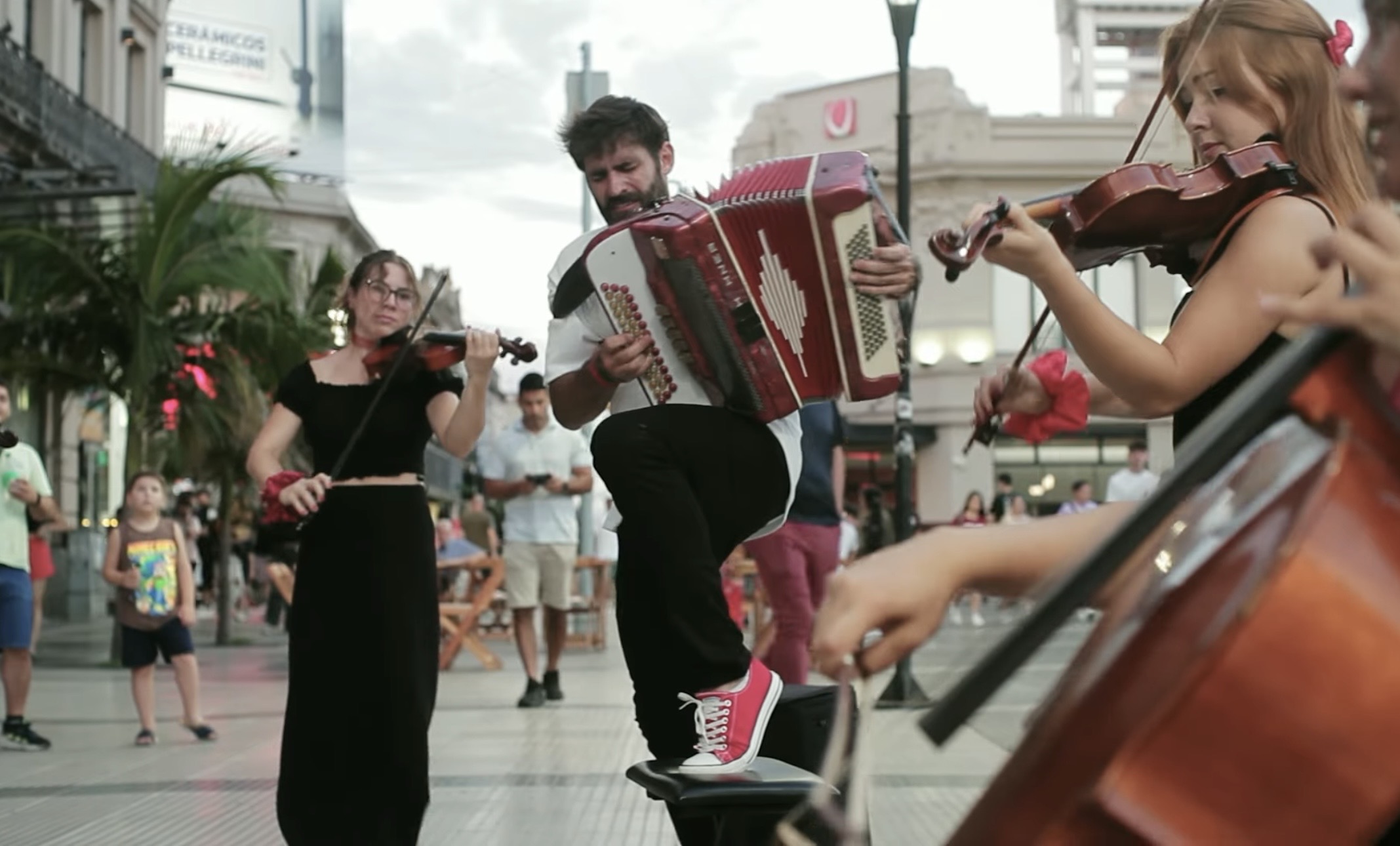 La acción se desarrolló en la peatonal San Martín y la Plaza 1º de Mayo, en pleno centro de la ciudad de Paraná, en un horario de alta circulación. En ese contexto, un ensamble de cuerdas emergieron desde distintos puntos del espacio urbano y confluyeron en la peatonal. Minutos después, se sumó Juan Manuel Bilat con su acordeón para interpretar una reversión de clásicos del chamamé, transformando el pulso cotidiano de la ciudad —en vísperas navideñas— en una experiencia sonora inesperada.
