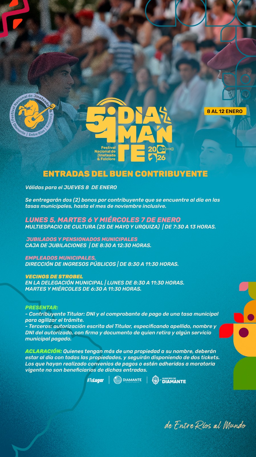 Aclaración: Quienes tengan más de una propiedad a su nombre, deberán estar al día con todas las propiedades, y seguirán disponiendo de dos tickets. Los que hayan realizado convenios de pagos o estén adheridos a moratoria vigente no son beneficiarios de dichas entradas. (Fuente: Municipio de Diamante)