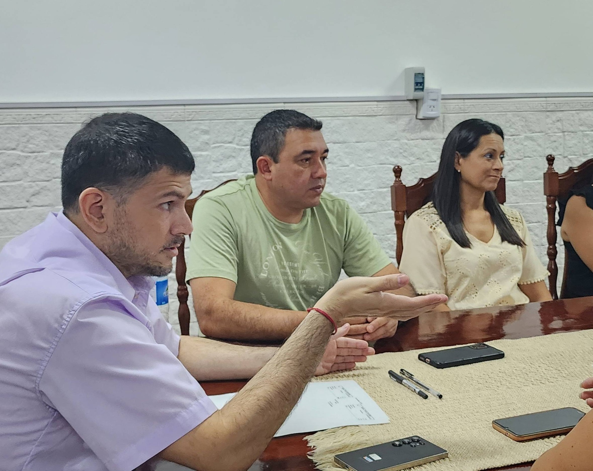 El intendente de Feliciano, Damián Arévalo junto a la Viceintendenta Marisa Leites, este martes, se reunieron en el municipio con representantes de las tres comparsas locales, presidente de la Comisión Municipal de Corsos y Comisario de Corsos.
