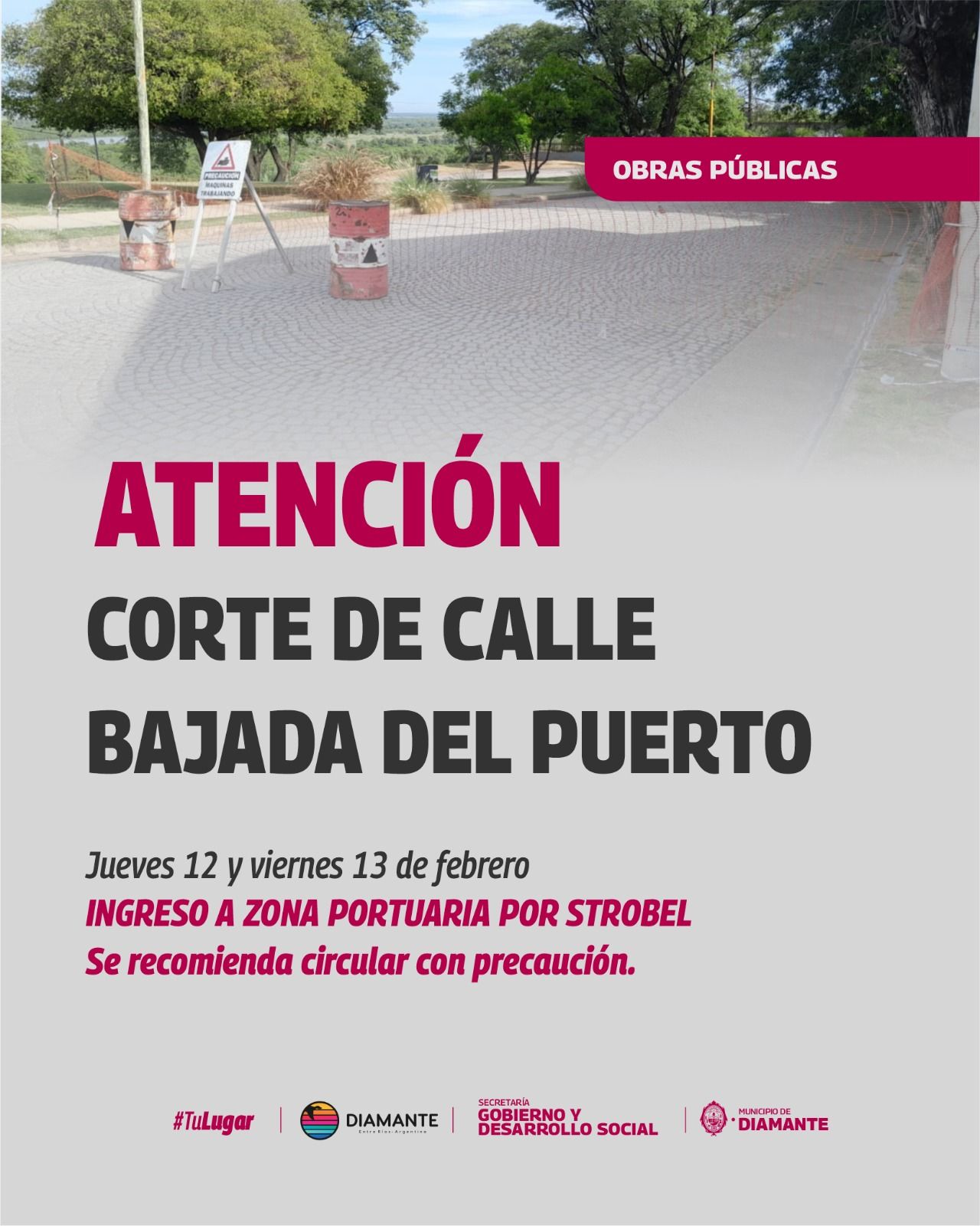 La Dirección de Obras Públicas de la Municipalidad de Diamante informa que, debido a las intensas lluvias registradas en las últimas horas, estará cortado el tránsito en la Bajada al Puerto, hoy jueves 12 y mañana viernes 13 de febrero.