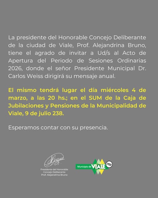 La Presidente del Honorable Concejo Deliberante de la ciudad de Viale, Prof. Alejandrina Bruno, invita a toda la comunidad a participar del Acto de Apertura del Período de Sesiones Ordinarias 2026.