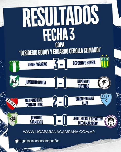 Además, Juventud Unida y Deportivo Tuyango empataron 1 a 1; Independiente Football Club le ganó 2 a 0 a Unión Football Club; Juventud Sarmiento hizo lo propio ante la Asociación Social y Deportiva Diego Maradona por 1 a 0, y Viale Football Club le ganó 3 a 0 a Atlético Sarmiento.