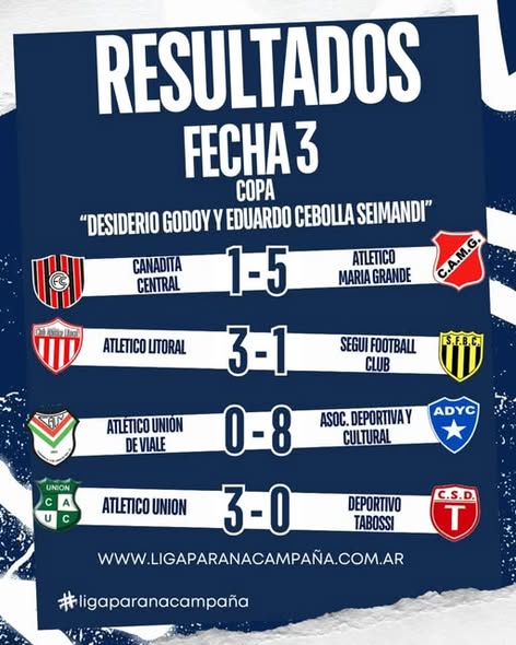 En tanto, Cañadita Central de Seguí cayó estrepitosamente por 5 a 1 ante Atlético María Grande, Litoral derrotó 3 a 1 Seguí Football Club; Atlético Unión de Viale sufrió una goleada por 8 a 0 ante la Asociación Deportiva y Cultura de Crespo; y Atlético Unión de Crespo marcó diferencias por 3 a 0 ante Deportivo Tabossi. (Fuente: Debate Abierto)