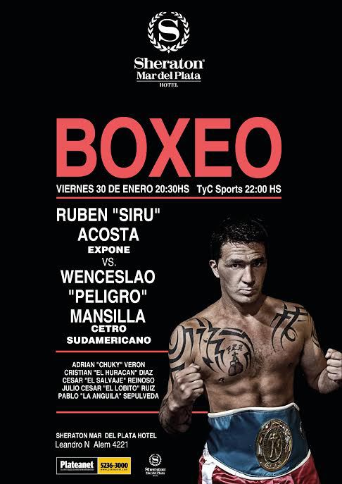 Uno es un experimentado y ya probado campeón. El otro, un joven que busca su ascenso. Y en una noche en escenario de lujo, solo uno saldrá victorioso. El campeón sudamericano supermediano, el ex retador mundialista bonaerense Rubén “Siru” Acosta, se enfrentará al invicto entrerriano Wenceslao “Peligro” Mansilla, intentando defender por cuarta ocasión su corona, en el combate estelar de la velada que se desarrollará el viernes 30 de Enero en el Sheraton Mar del Plata Hotel, de Mar del Plata, provincia de Buenos Aires, en una nueva producción de Argentina Boxing Promotions, de Mario Margossian, que será transmitida en vivo a través de TyC Sports a partir de las 22, para Argentina y toda América.