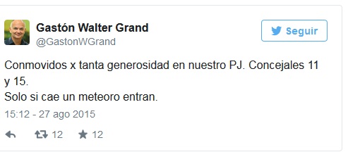 “Conmovidos x tanta generosidad en nuestro PJ. Concejales 11 y 15. Sólo si cae un meteoro entran”, ironizó Grand.