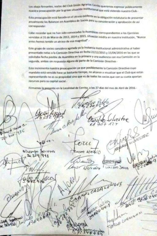 Los abajo firmantes, socios del Club Unión Agrarios Cerrito queremos expresar públicamente nuestra preocupación por la grave situación institucional que está viviendo nuestro Club.