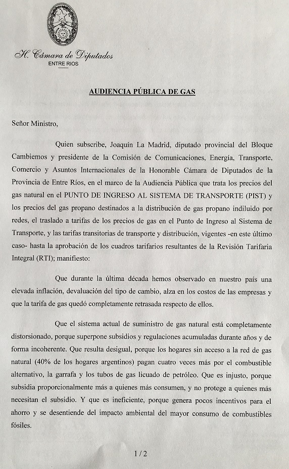 Joaquín La Madrid, diputado provincial del Bloque Cambiemos, manifestó en la misiva dirigida al Ministro Aranguren que “durante la última década hemos observado en nuestro país una elevada inflación, devaluación del tipo de cambio, alza en los costos de las empresas y que la tarifa de gas quedó completamente retrasada respecto de ellos. Además, el sistema actual de suministro de gas natural está completamente distorsionado, porque superpone subsidios y regulaciones acumuladas durante años y de forma incoherente; y claramente resulta un sistema desigual, porque los hogares sin acceso a la red de gas natural (que es el 40% de los hogares argentinos) pagan cuatro veces más por el combustible alternativo, la garrafa y los tubos de gas licuado de petróleo”. En este sentido, quien es además presidente de la Comisión que aborda las temáticas de energía de la Honorable Cámara de Diputados de la Provincia de Entre Ríos, realizó una importante consideración: “Es injusto, porque subsidia proporcionalmente más a quienes más consumen, y no protege a quienes más necesitan el subsidio; y es ineficiente, porque genera pocos incentivos para el ahorro y se desentiende del impacto ambiental del mayor consumo de combustibles fósiles”.