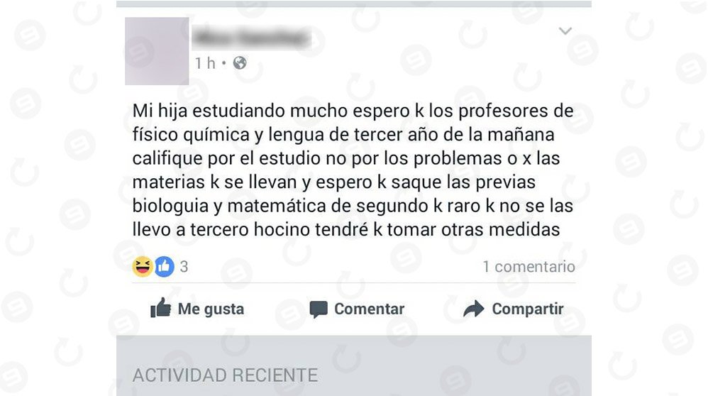 “Así nos amenazan a los docentes algunos padres“, confió una de las profesoras aludidas. “Con léxico propio, escriben en páginas de escuelas donde otros estudiantes ven este tipo de comentarios“, subrayó.