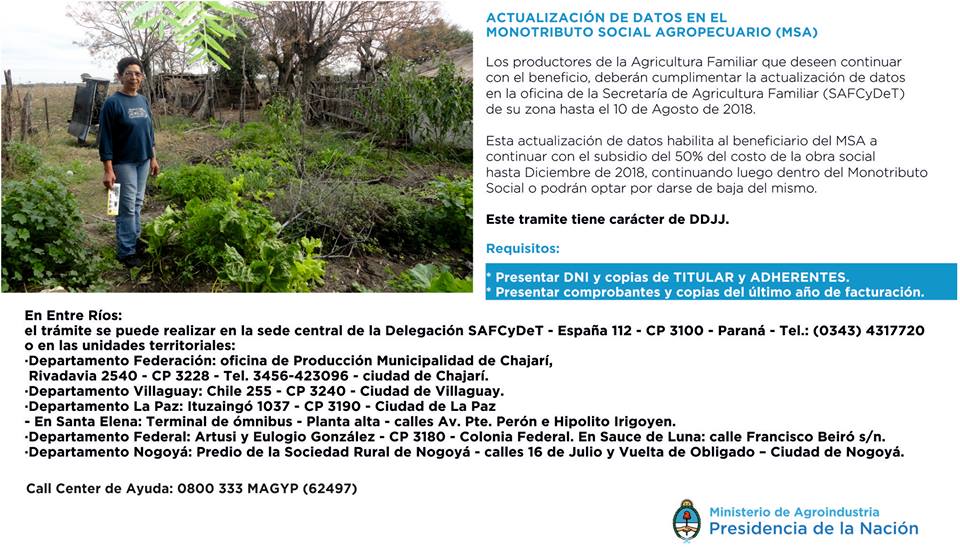 La Subsecretaría de Agricultura Familiar, Delegación Entre Ríos, informa que se suspenden las reuniones que iban a llevarse a cabo este viernes 27, en la zona de Crucesita 7a (departamento Nogoyá), en el marco del reempadronamiento del Monotributo Social Agropecuario.