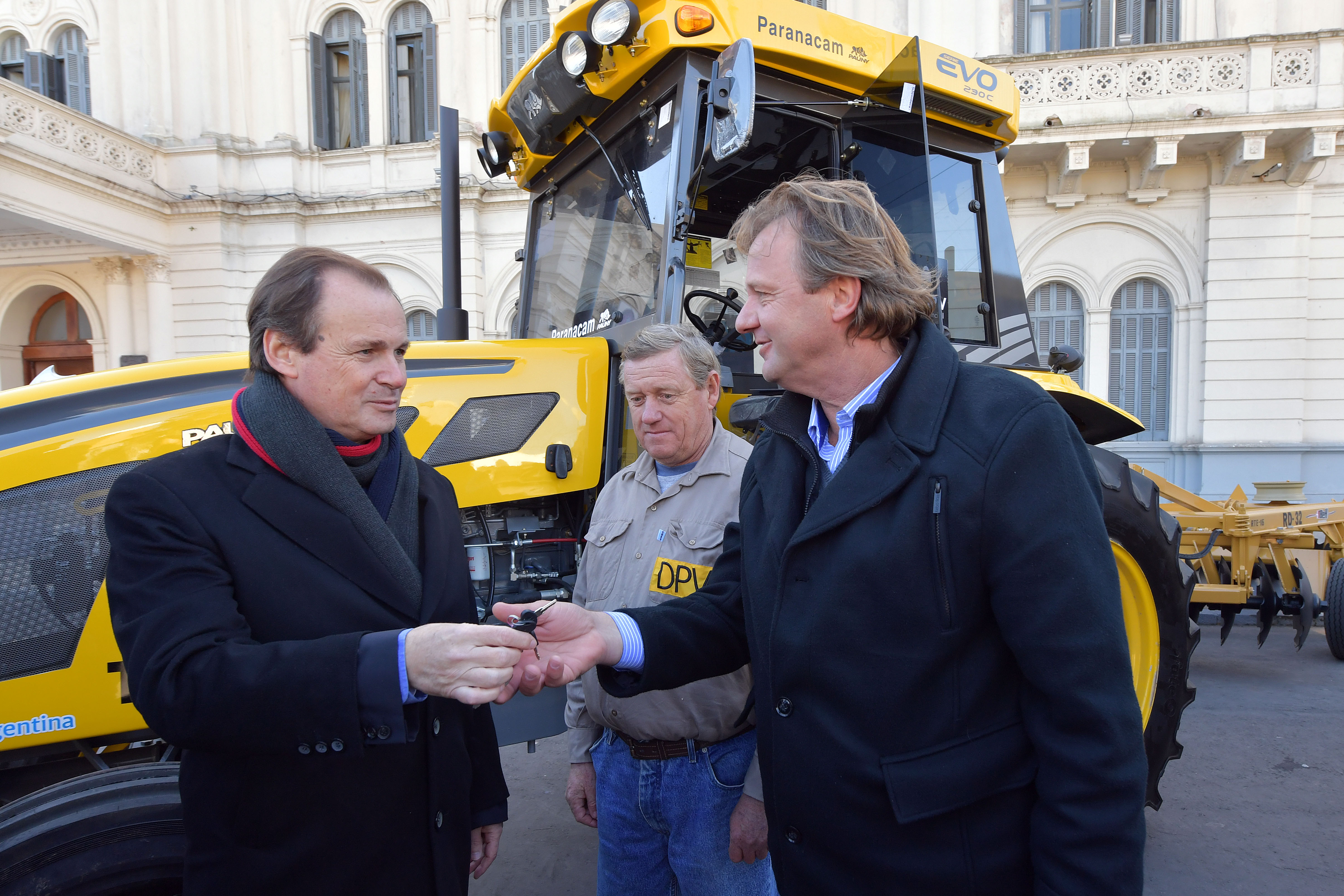 Nueve tractores, cinco rastras y dos camiones Mercedez Benz serán destinados a las Zonales que Vialidad posee en diferentes lugares de la provincia. En la Plaza Mansilla, frente a la Casa de Gobierno, donde Bordet observó la maquinaria y le entregó las respectivas llaves a quienes tendrán a cargo los vehículos de trabajo.