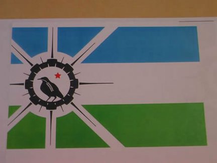 La franjas en colore azul, blanco y verde se ubican en forma horizontal, teniendo en la parte central un engranaje, rayos de sol, un pájaro casero y la estrella roja federal, símbolo de la provincia de Entre Ríos.