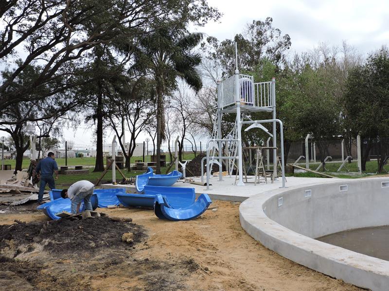 En este momento se está colocando el nuevo tobogán acuático y se trabaja en la construcción del espacio destinado a solárium. (Fuente: Municipalidad de Cerrito)