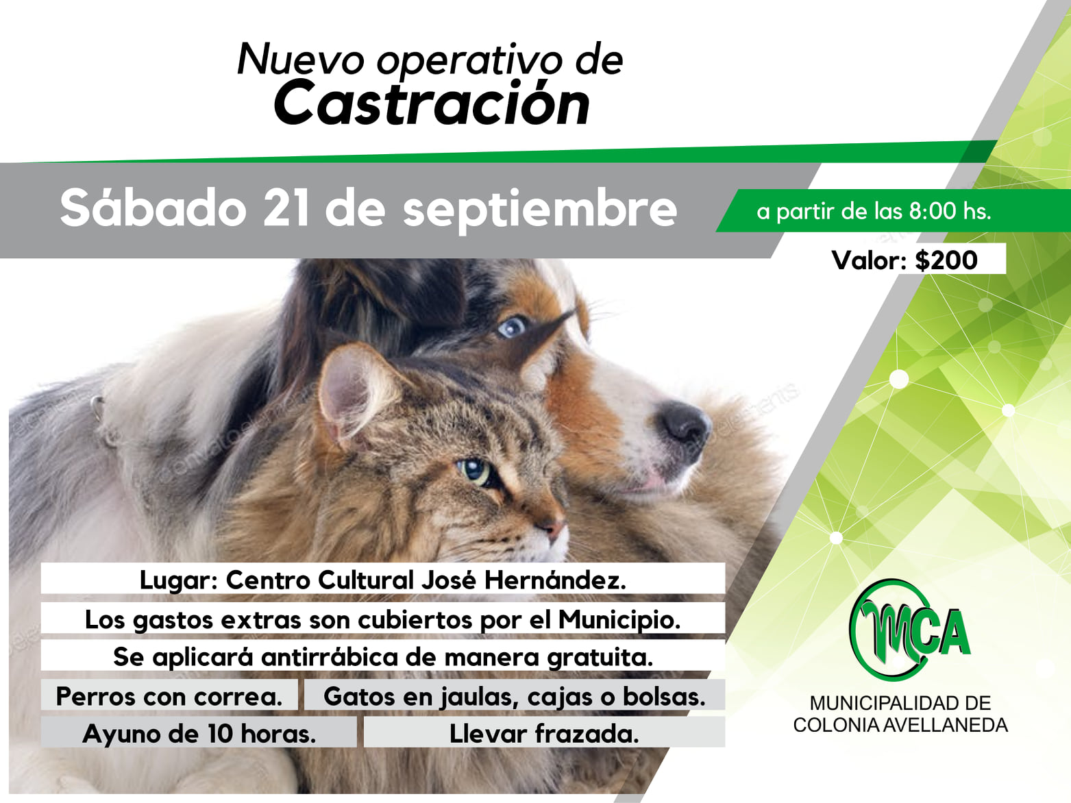 Este sábado 21 de septiembre, en el Centro Cultural José Hernández, se realizará un nuevo operativo de castración para mascotas a los que se atenderá por orden de llegada.