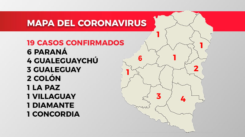 De acuerdo a la información reportada hasta este lunes a las 19, el área de Vigilancia Epidemiológica del Ministerio de Salud indica que en Entre Ríos no se registraron nuevos casos de coronavirus. Hay registrados 19 casos hasta la fecha.