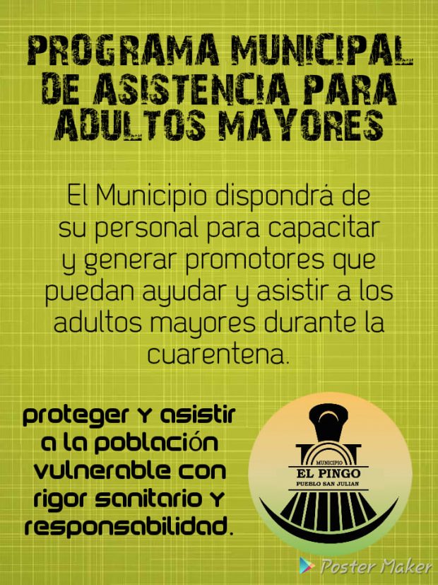 El municipio de El Pingo, dispondrá de su personal para capacitar y generar promotores que puedan ayudar a adultos mayores. “Cuidar a la población de riesgo ante la pandemia es un desafío que debemos asumir como sociedad. Todos podemos aportar quedándonos en casa y respetando todas las indicaciones sanitarias”, manifestaron.