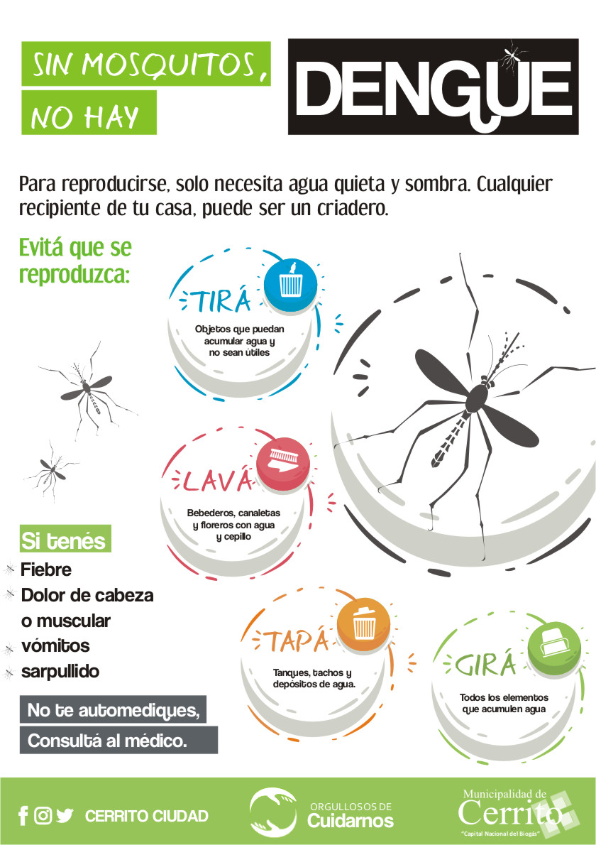 El Municipio de Cerrito inicia una fuerte campaña de concientización en su comunidad, para poder disminuir la reproducción del insecto. Para ello, es importante dar a conocer los hábitos y las condiciones que favorecen el desarrollo o el tiempo de vida del mosquito, para actuar con mayor eficacia en las tareas de prevención de la enfermedad.
