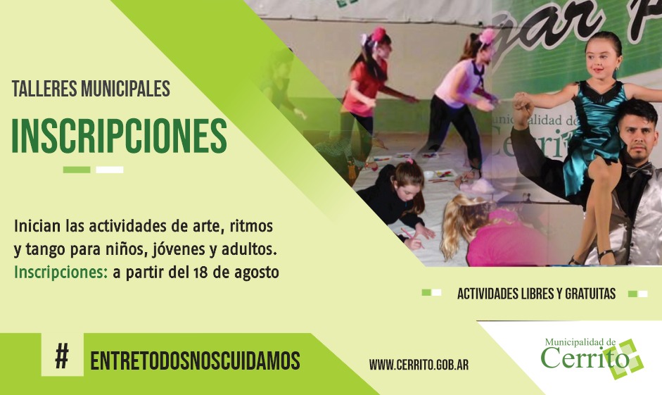 El Área Turismo y Cultura de la Municipalidad de Cerrito informa que, a partir del martes 18 de agosto comenzarán las inscripciones para los talleres municipales de tango, arte y danza.