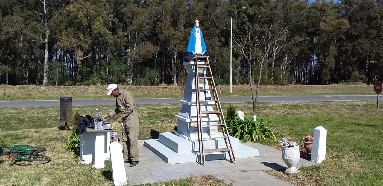 Las tareas incluyen la restauración de la imagen religiosa, pintura y refacción de bancos, y limpieza y parquización del predio que se encuentra en el cruce de Cerrito a Pueblo Moreno.(Fuente: Municipalidad de Cerrito)