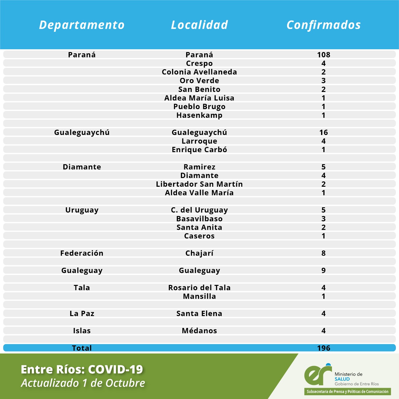 El área de Vigilancia Epidemiológica de Entre Ríos, confirmó que este jueves, se registraron 196 nuevos casos de coronavirus y de ese modo, son 7.765 los casos confirmados en la provincia.